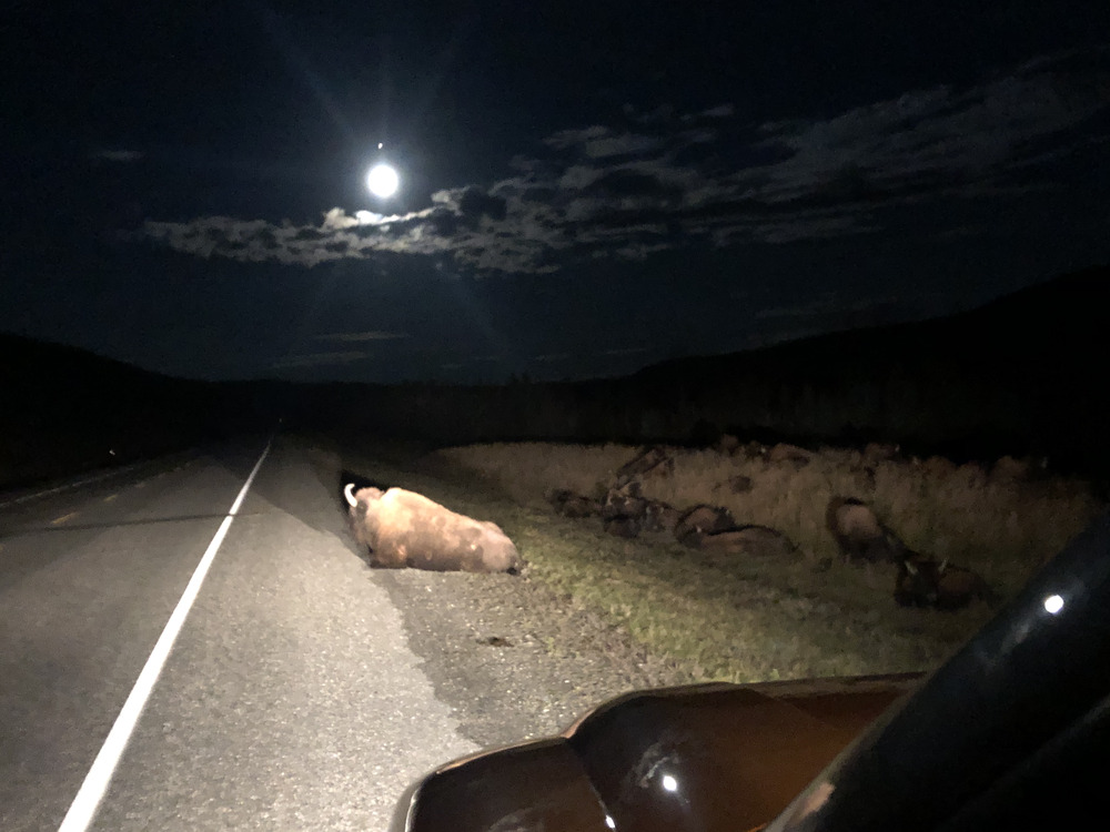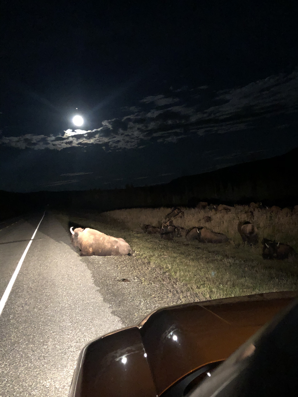I was already feeling that night driving was a little risky in the area, and decided to stop at a nearby lodge, after flying by this one bison that was sticking out in the road.